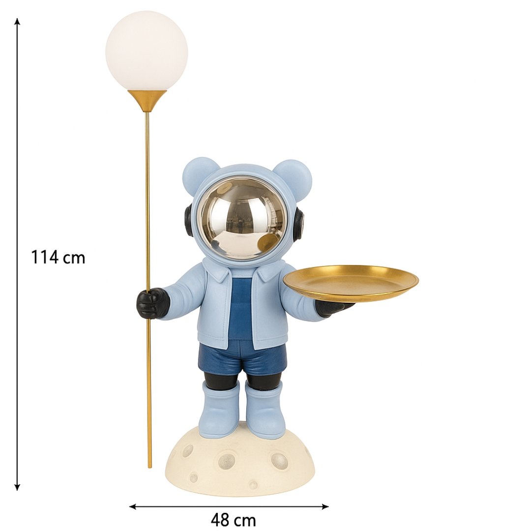El astronauta, cuidadosamente elaborado con detalles realistas y acabados metálicos de alta calidad, sostiene un globo luminoso que emite una luz cálida y agradable, ideal para crear ambientes acogedores y modernos. A su lado, una bandeja dorada aporta un toque elegante y práctico, perfecta para colocar llaves, relojes, dulces o pequeños objetos decorativos.