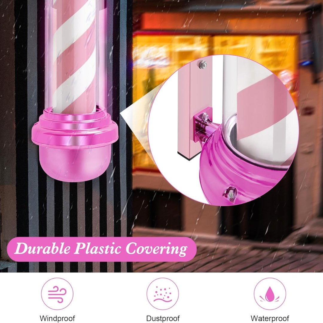 Fabricado con materiales resistentes y de alta durabilidad, este cilindro combina estilo, iluminación y visibilidad, convirtiéndose en el complemento perfecto para cualquier fachada. Su tono rosado vibrante proyecta una imagen fresca y contemporánea, ideal para barberías que quieren diferenciarse.
