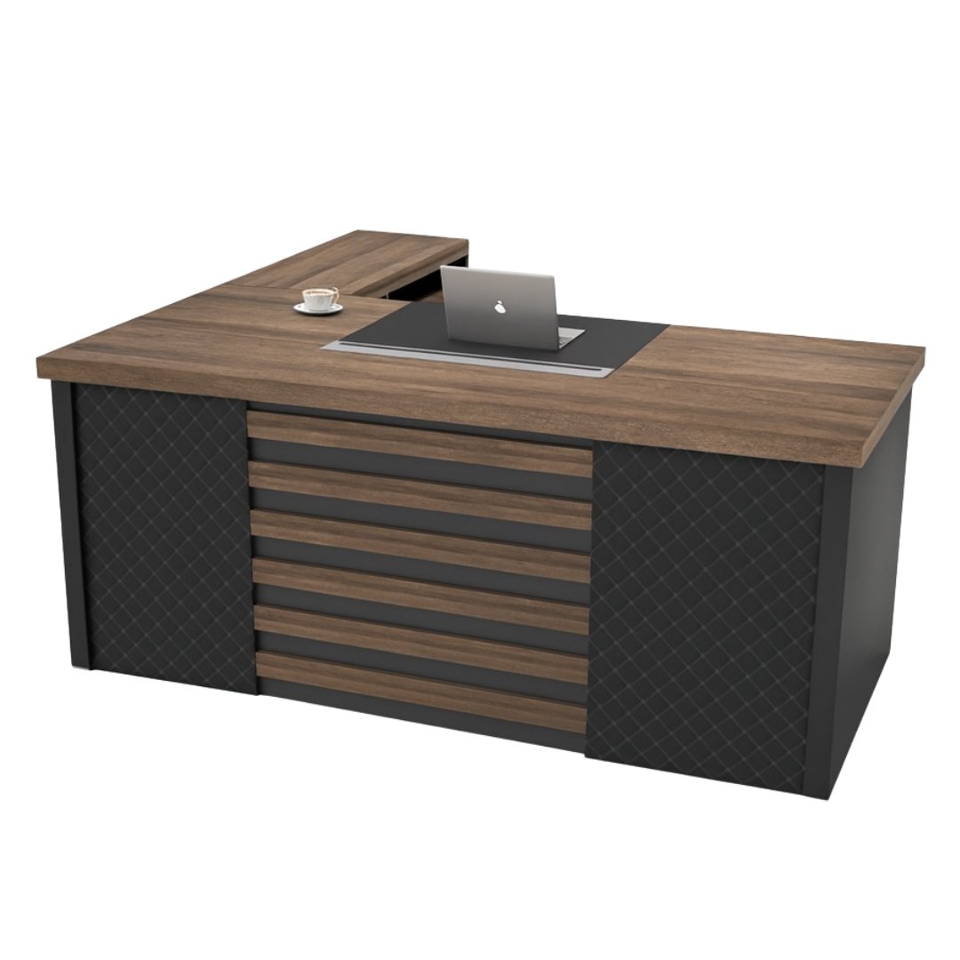 Un escritorio presidencial moderno y elegante, perfecto para oficinas ejecutivas. Su acabado en wengue y gris ofrece estilo, amplitud y funcionalidad, ideal para trabajar con comodidad y mantener una apariencia profesional en cualquier espacio.