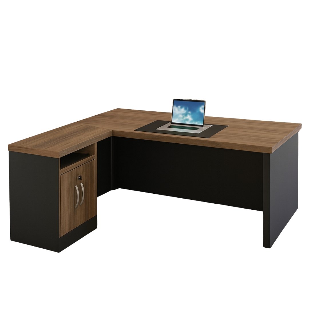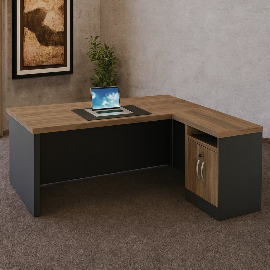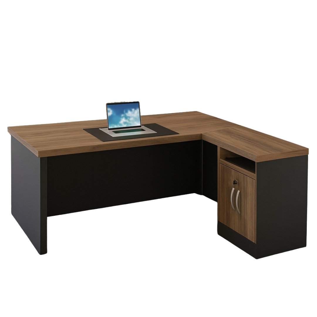 Fabricado en melamina de alta resistencia, este escritorio garantiza durabilidad, estabilidad y fácil limpieza. Incluye un módulo lateral con cajón y puerta para maximizar la organización, manteniendo a la mano todos los elementos esenciales del día a día, desde documentos importantes hasta accesorios de trabajo.