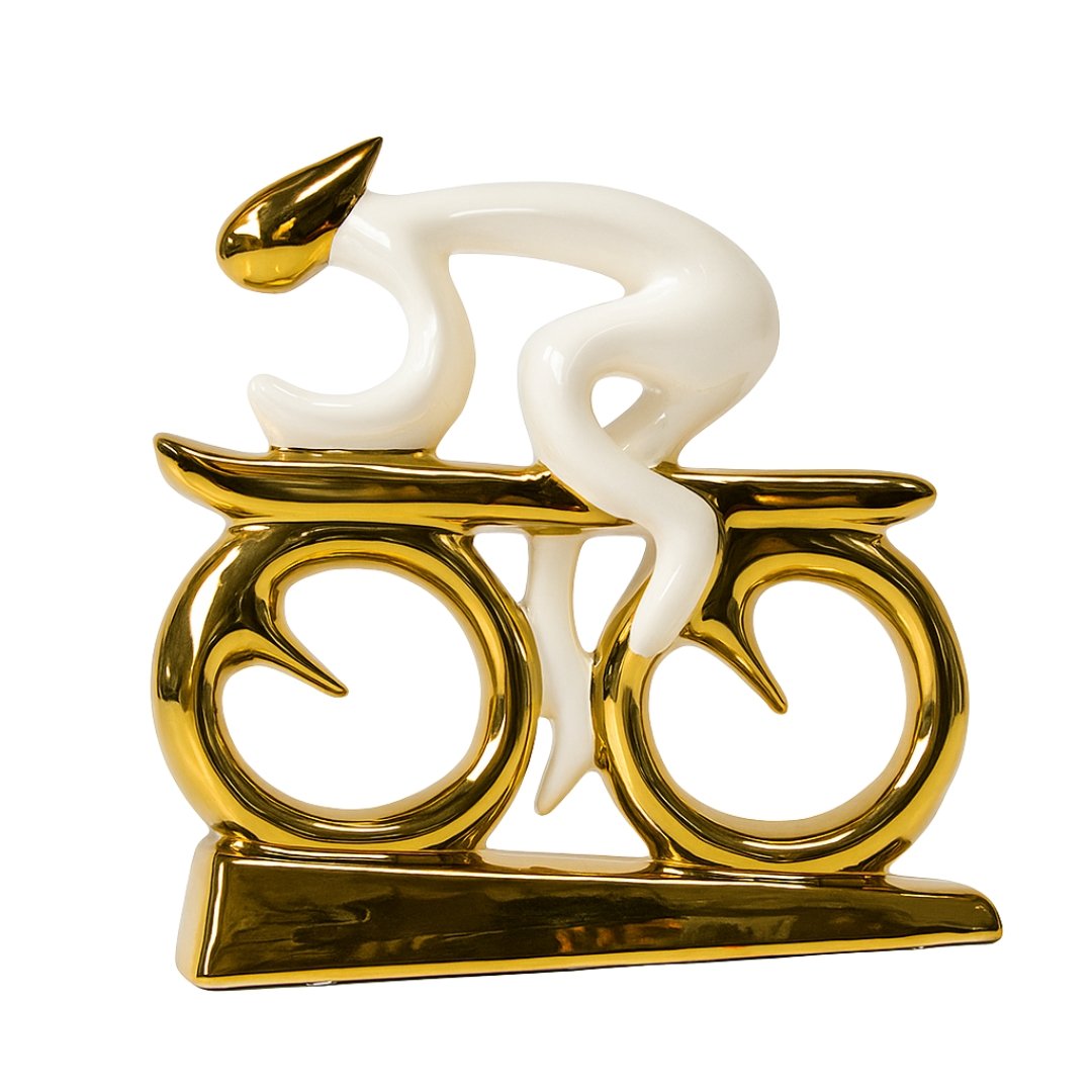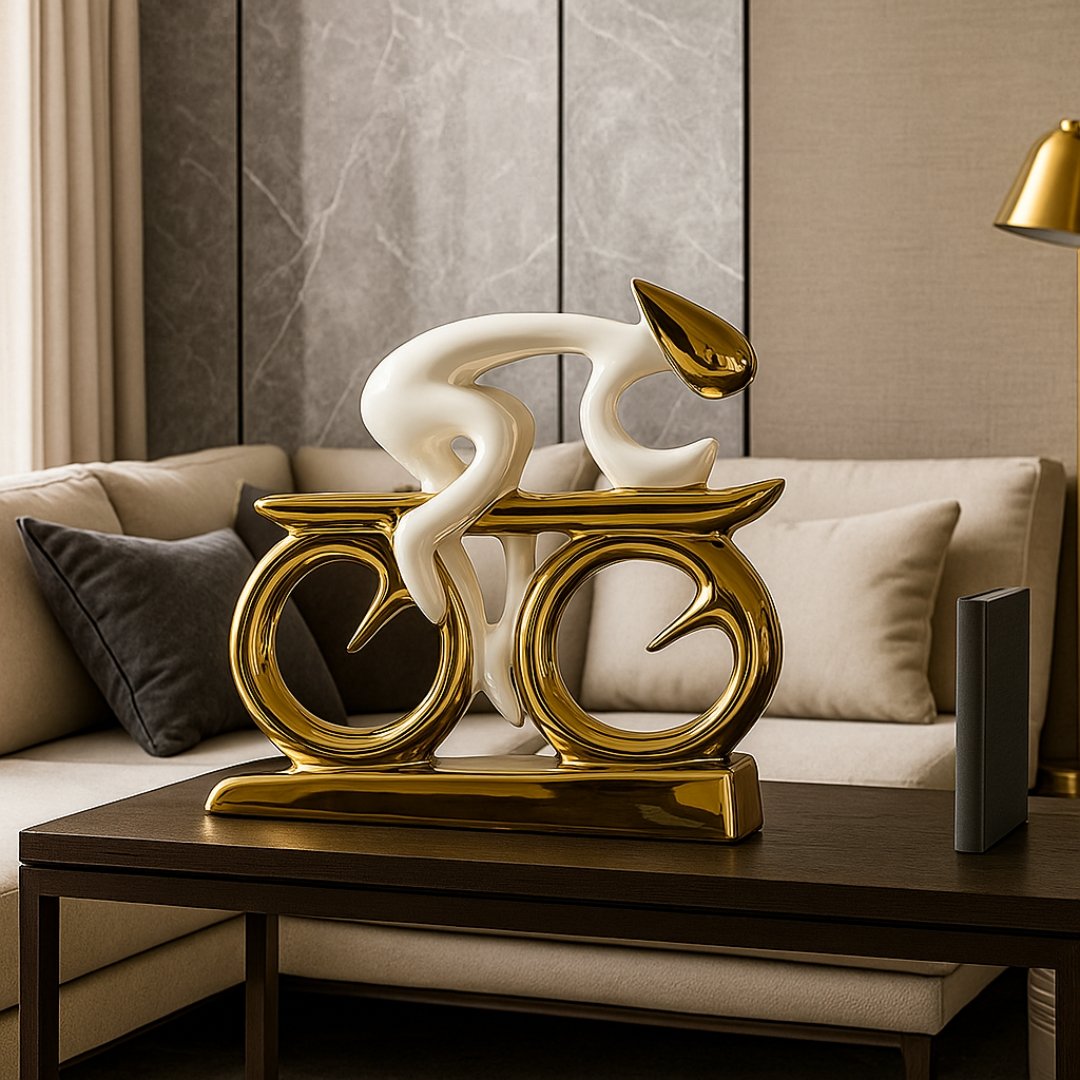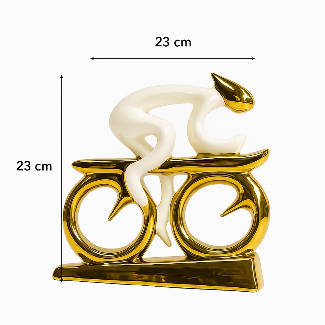 Su forma abstracta, con líneas suaves y fluidas, representa la armonía entre la fuerza y la velocidad, evocando la pasión por el ciclismo y el espíritu de superación. El contraste entre el brillante dorado metálico y el blanco marfil crea una pieza visualmente impactante que se adapta con facilidad a diferentes estilos de decoración: moderno, elegante, deportivo o artístico.