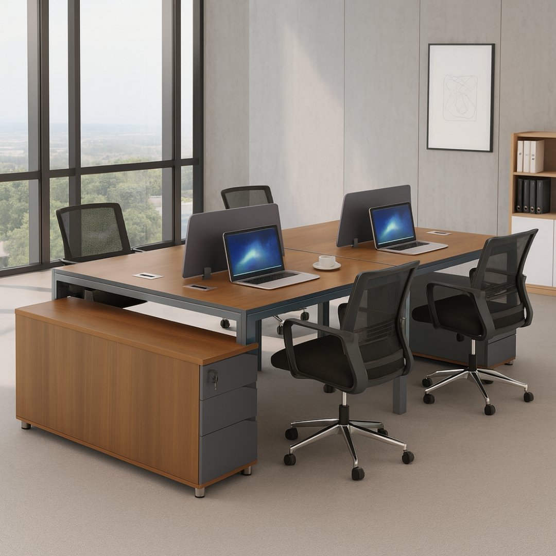 Fabricado en melamínico wengue de alta resistencia combinado con estructura metálica gris, garantiza durabilidad, elegancia y fácil limpieza. Incluye paneles divisores que brindan privacidad visual y archivador de lado a lado, pensado para mantener todo en orden y a la mano.