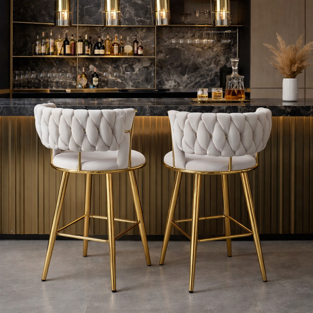 El respaldo incorpora un cojín tapizado en terciopelo suave, brindando una experiencia cómoda y refinada al sentarse. Su diseño estilizado la hace ideal para barras modernas, comedores elegantes o restaurantes premium.